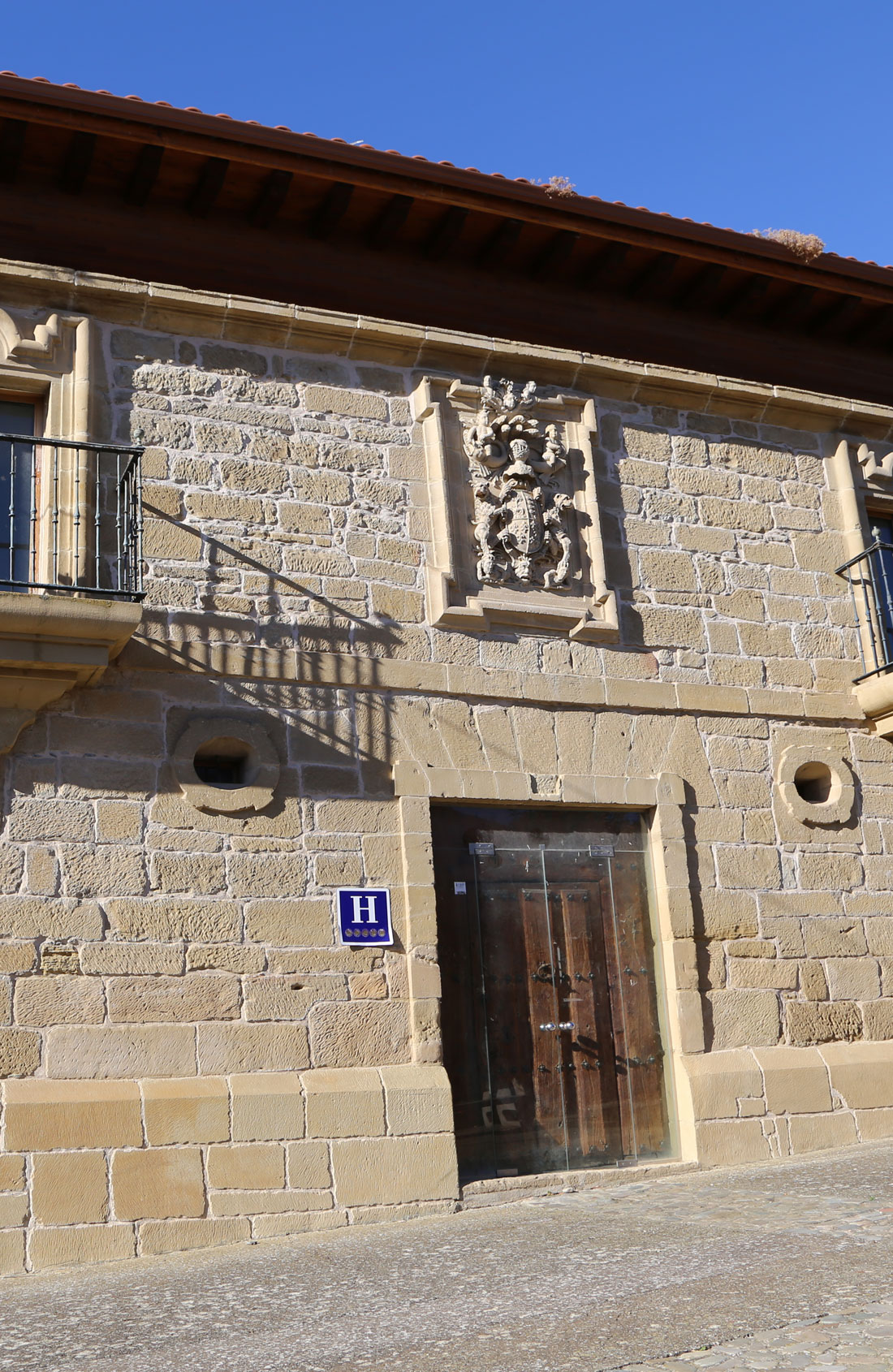 Entre los balcones y sobre la entrada al palacio se encuentra el escudo nobiliario de la familia, cuartelado en cruz, bajo yelmo de hidalgo con penacho y flanqueado por dos leones rampantes, rodeado todo él de gran cantidad de motivos ornamentales. Cabe destacar la zona central del escudo donde puede verse: en el primer cuartel, lobo pasante resaltado sobre árbol; en el segundo cuartel 13 roelas dispuestas de tres en tres y la última en punta; en el tercero tres flores de lis; y en el cuarto cinco flores de lis.